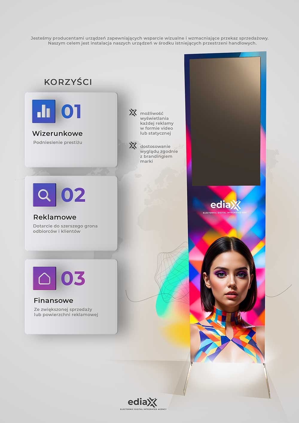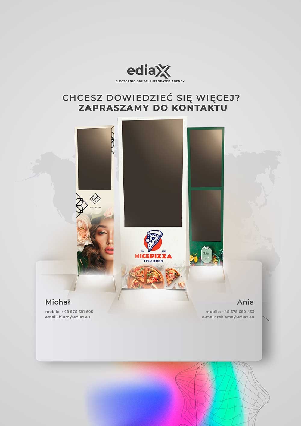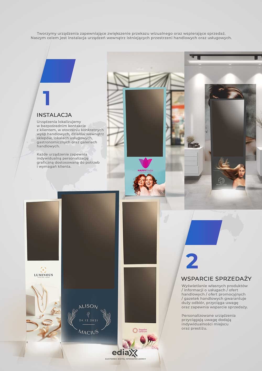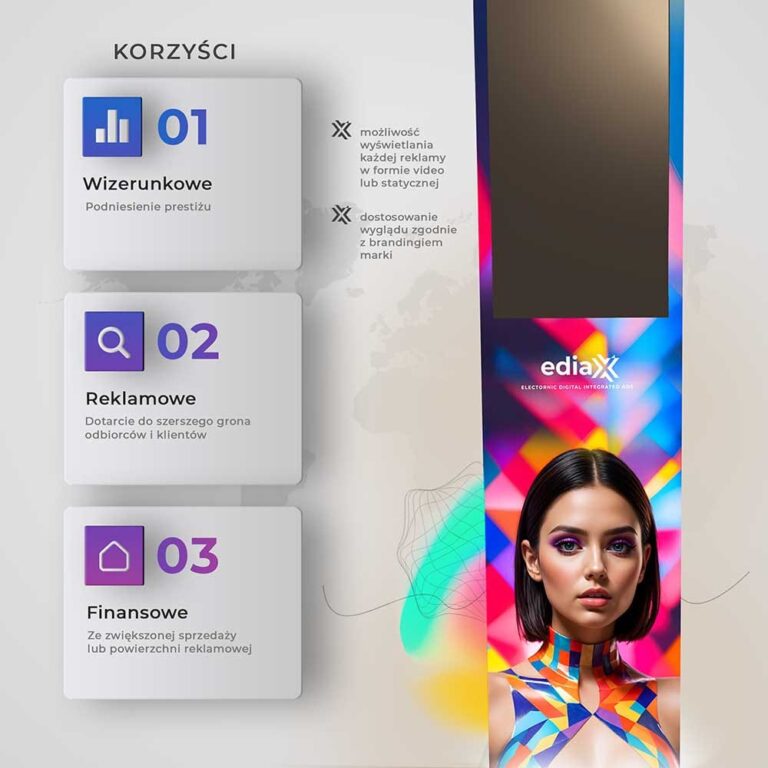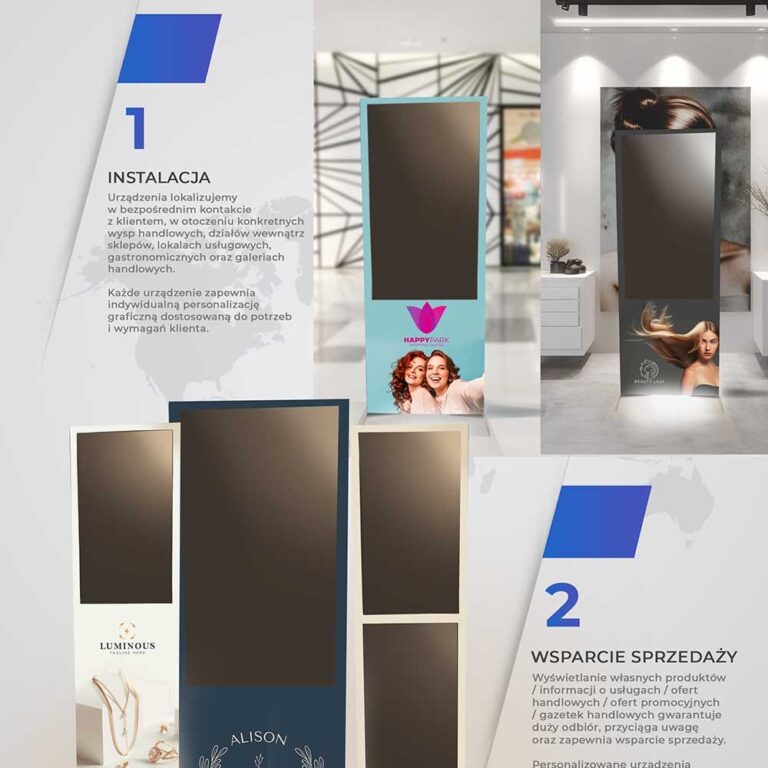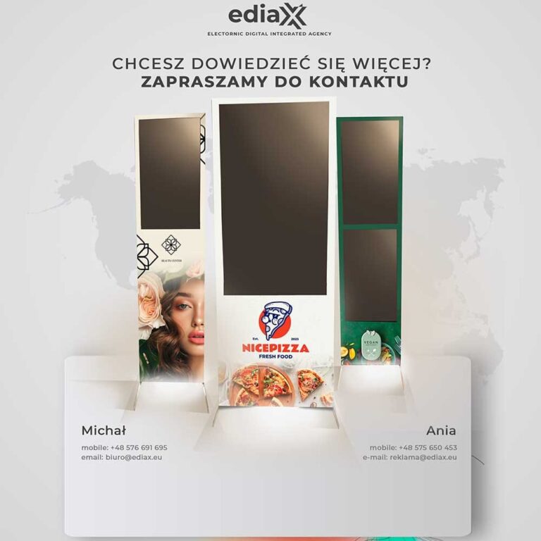 EDIAX 32 EKRAN O PRZEKĄTNEJ 32 CALI Wymiary: 1800 x 500 x 80 [mm] cena: 9 000 zł netto EDIAX 32 D&D DWA EKRANY O PRZEKĄTNEJ 32 CALI Wymiary: 1800 x 500 x 80 [mm] cena: 12 000 zł netto EDIAX 55 EKRAN O PRZEKĄTNEJ 55 CALI Wymiary: 2000 x 765 x 200 [mm] cena: 15 000 zł netto EdiaxTWORZYMY URZĄDZENIA DLA CIEBIE I TWOJEGO BIZNESUOferta urządzeń ediaX dedykowana jest dla Twojej branży. Wybierz ediaX'a dostosowanego do Twoich potrzeb! Tworzymy od podstawediaX-y robione są od podstaw w Polsce Intuicyjny system operacyjnyStworzyliśmy specjalny system implementując AI Dedykowany Support OnlineZawsze pomagamy i rozwiązujemy problemy!